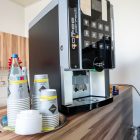 Im Erdgeschoss steht Ihnen außerdem ein großer Aufenthaltsraum zur Verfügung. Dort finden Sie eine Kaffeemaschine sowie einen Snack- und Getränkeautomaten, der rund um die Uhr zugänglich ist. Das ist praktisch, wenn Sie sich nach einem langen Tag noch unkompliziert versorgen oder den Abend in Ruhe ausklingen lassen möchten.